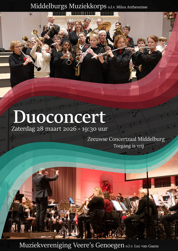 Het Middelburgs Muziek Korps (MMK) en muziekvereniging Veere’s Genoegen uit Veere geven zaterdagavond 28 maart een duoconcert in de Zeeuwse Concertzaal in Middelburg.
